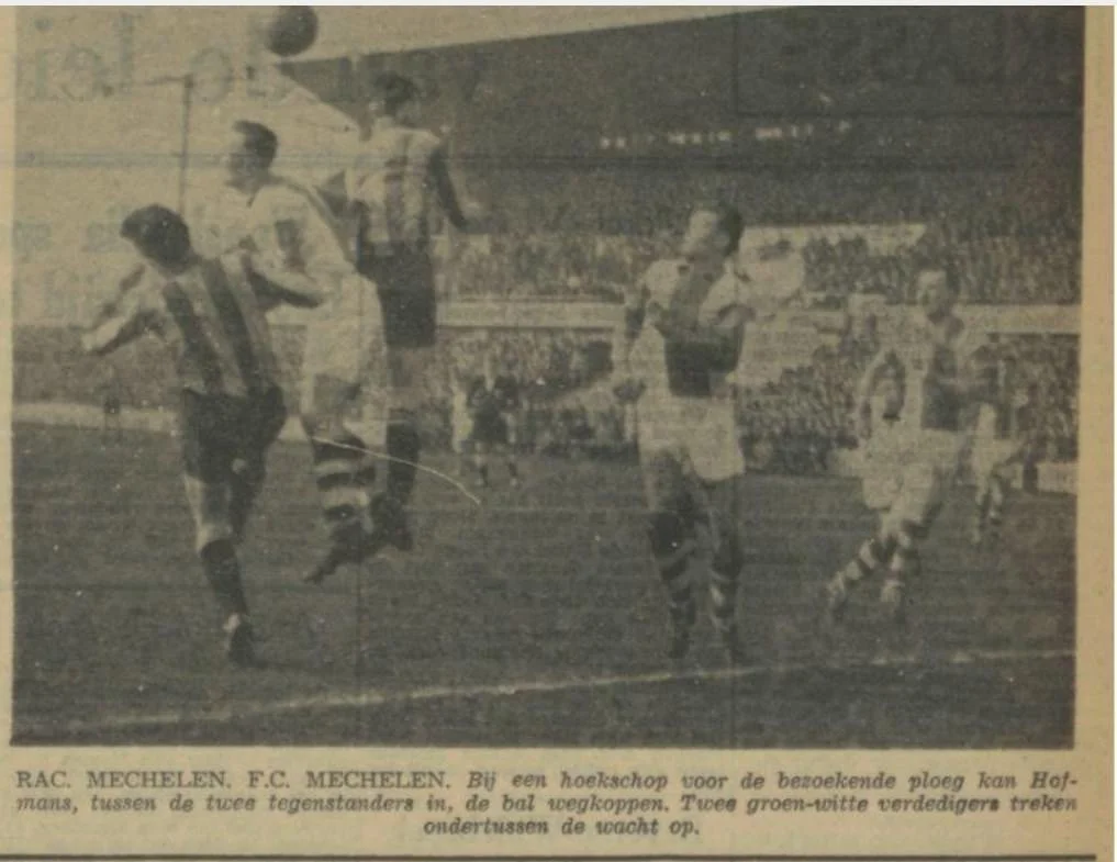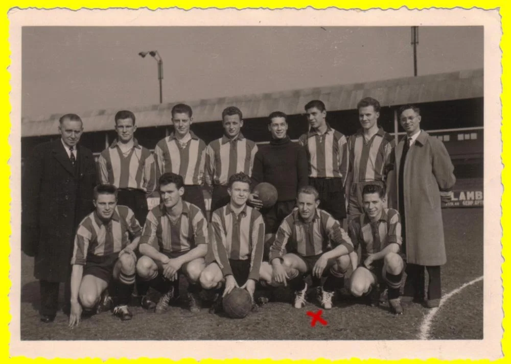 In de jaren ’50 en ’60 kende Malinwa een erg bewogen periode vol sportieve hoogte- en dieptepunten. Na een korte titelambitie in 1953-1954 zakte de club twee jaar later verrassend weg naar tweede klasse, waar ze de rest van het decennium bleef. Een lichtpunt was de komst van jeugdtalent Fi Vanhoof in 1952, die later zou uitgroeien tot een clubicoon. Ook de truitjes kenden in deze periode enkele experimenten, maar de geel-rode strepen bleven uiteindelijk de vaste waarde.Dit shirt, met klassiek ontwerp, werd eind jaren ’50 en begin jaren ’60 afwisselend gebruikt. De exacte datering is moeilijk vast te leggen door het beperkte beeldmateriaal, maar omdat dit truitje een rugnummer droeg, is zeker dat het nog tot minstens 1963 werd gebruikt.