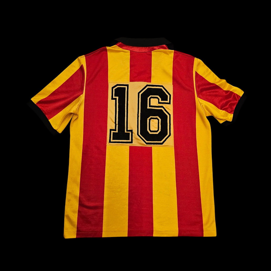 Dit Europese wedstrijdshirt is van het merk Adidas en uitgevoerd in een geel-rood gestreept ontwerp. De V-hals is rood met een zwarte afwerking, en ook de manchetten zijn zwart. Op de linkerborst staat een groot clubembleem.